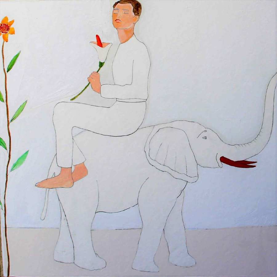 Nei suoi quadri solitamente inserisce un unico personaggio, come nell’opera proposta in questa mostra, solo e distaccato fisicamente e psicologicamente, riuscendo a cogliere un momento particolare, quasi il preciso secondo in cui il tempo si ferma e tutto appare immobile, silenzioso. Il suo lavoro parla di solitudine, di malinconia e di tempo sospeso. In “Il Fiore e l’Elefante”, disegno a matita su carta, ritrae un ragazzo e un elefante riuscendo a cogliere una dimensione di sottile inquietudine e mistero. Il lavoro ci ricorda che per secoli l’uomo ha vissuto in armonia con animali e piante creando una rete circolare della vita che collegava tutti i viventi sullo stesso livello.