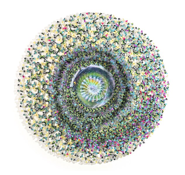 Tra le sue opere più iconiche e potenti, i Dreamcatcher che sembrano frutto di un’esplosione, “un’esplosione che però non deflagra fino a disperdersi - scrive Angelo Crespi nel testo curatoriale - la forza centrifuga impressa trova infatti un bilanciamento nella forza centripeta, così lo sguardo è costretto a muoversi tra il fuori e, riprecipitando, il dentro, in un continuo sforzo tra concentrazione e dissipazione, un moto oculare esasperato dal vorticoso procedere degli elementi che si tengono in fragile equilibrio, farfalle e foglie, nel colore prima intenso, verso il centro, e poi ai bordi sempre più rarefatto”.