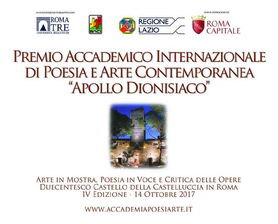 L’Accademia Internazionale di Significazione Poesia e Arte Contemporanea di Roma, Polo di libera creazione, ricerca e significazione del linguaggio poetico e artistico, in Convenzione formativa con l’Università degli Studi di Roma Tre e con il Patrocinio dell’ANCI, della Regione Lazio e di Roma Capitale, Presidente fondatrice la prof.ssa Fulvia Minetti, Vicepresidente il dott. Renato Rocchi, Direttore Artistico Antonino Bumbica, cerimonia il Premio Accademico Internazionale di Poesia e Arte Contemporanea “Apollo dionisiaco” sabato 14 Ottobre 2017 dalle ore 15,30 presso il Salone del duecentesco Castello della Castelluccia in Roma.