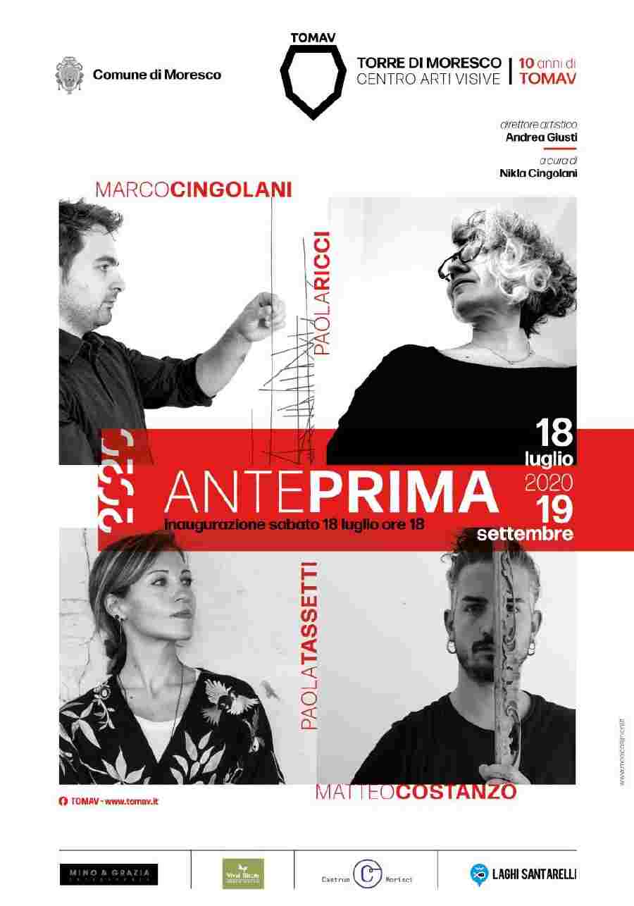 Dal 18 luglio al 19 settembre 2020 il TOMAV – Torre di Moresco Centro Arti Visive celebra i dieci anni di attività con una singolare esposizione dal titolo Anteprima con le opere di Marco Cingolani, Matteo Costanzo, Paola Ricci e Paola Tassetti.