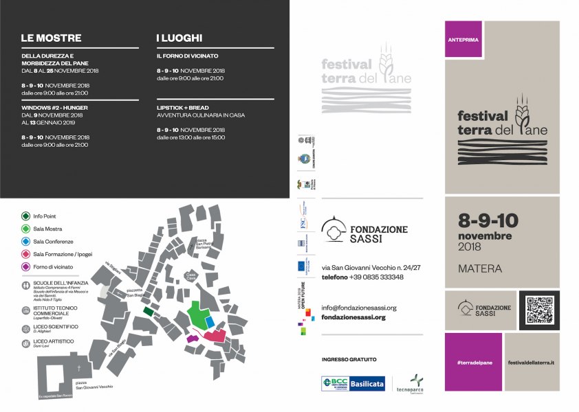 Da giovedì 8 novembre a sabato 10 novembre 2018, gli ambienti ipogei e le case palazziate della Fondazione Sassi nel rione sasso Barisano a Matera ospiteranno 47 appuntamenti tutti a ingresso libero. Ogni giorno, dalle 9 alle 22, incontri dedicati a arte, tradizioni, performance di danza, teatro e musica, film, letture partecipate, incontri con critici d’arte, esperti di marketing, artisti, giornalisti e testimoni della vita nei Sassi, creeranno un racconto composto da differenti codici linguistici ed espressivi che ha per fil rouge: il pane e la terra.