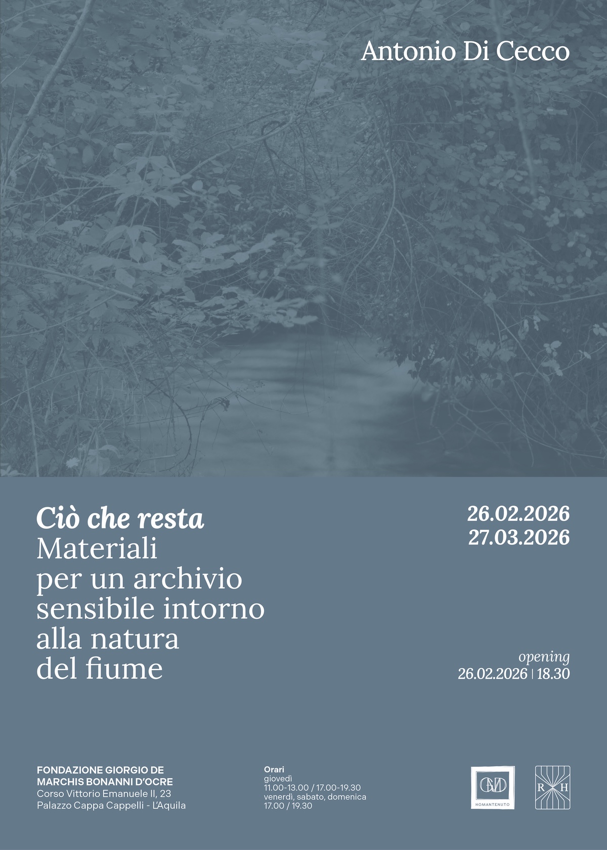 Giovedì 26 febbraio 2026 alle ore 18.30, la Fondazione Giorgio de Marchis Bonanni d'Ocre è lieta di ospitare la mostra Ciò che resta - Materiali per un archivio sensibile intorno alla natura del fiume di Antonio Di Cecco, a cura della Fondazione e di RVM Hub.
