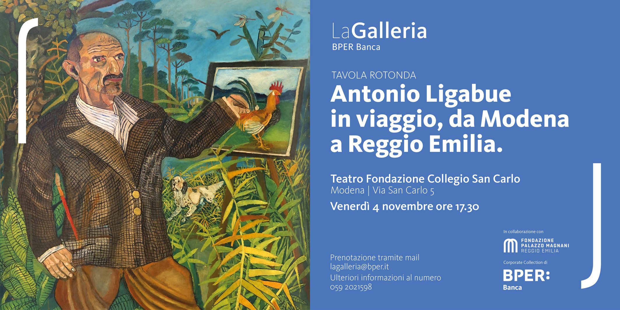 La Galleria BPER Banca e la Fondazione Palazzo Magnani insieme per una tavola rotonda aperta al pubblico sul tema Antonio Ligabue in viaggio, da Modena a Reggio Emilia, in programma venerdì 4 novembre, alle ore 17.30, presso il Teatro Fondazione Collegio San Carlo a Modena (via San Carlo, 5).
