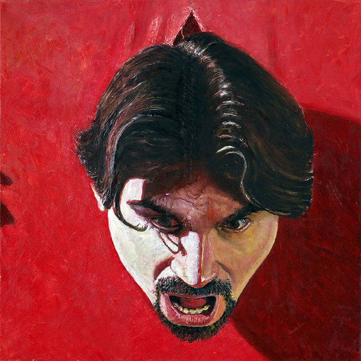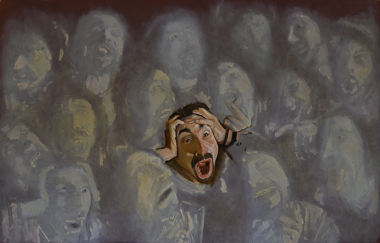 Potremmo concepire come una lunga ed articolata “autobiografia per immagini” la selezione dei lavori di Antonio Russo in mostra presso Spazio Urano; l’artista inserisce se stesso, a volte si moltiplica con ossessione, nei vari dipinti ad olio e tempera, eleggendosi così indiscusso protagonista oltre che autore delle opere.