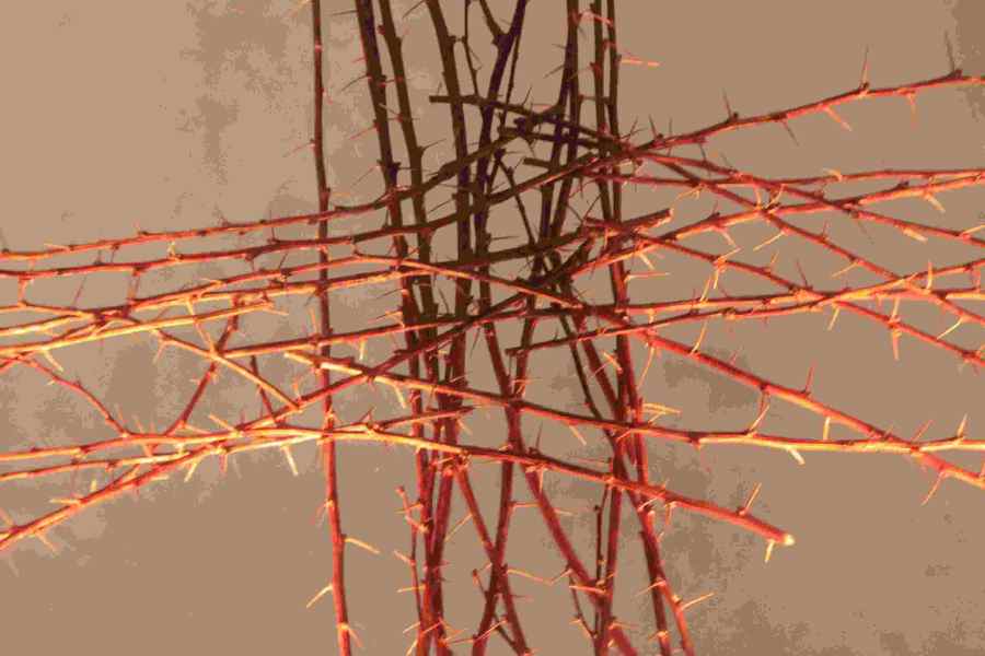 straordinariamente imbrigliati, elementi solitari, ma molto evocativi: le corde, i chiodi, le spine, il sangue, le lacrime, le mani
