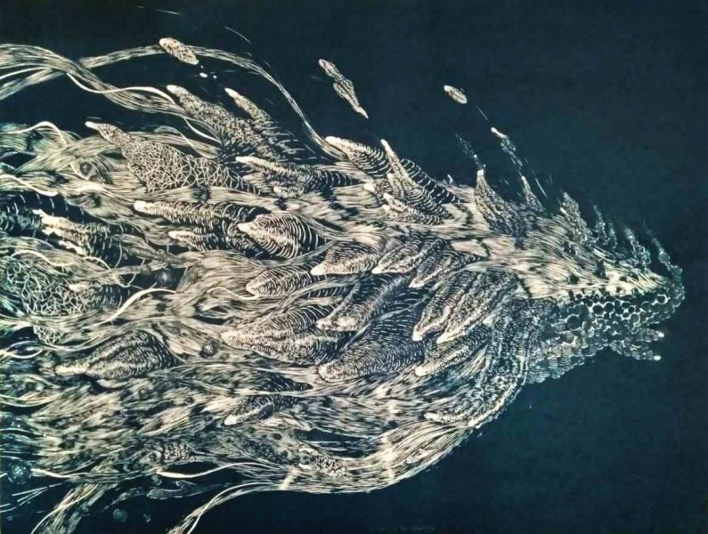 Mentre incide o disegna, avviene l’epifania: tentacoli o forse organismi unicellulari, paesaggi degli abissi o scenari post apocalittici, poco importa di ricercare un parallelo con la realtà conosciuta, la sua Natura è un’infinita manifestazione di opere d’arte di cui non resta altro che subire il fascino di uno spettacolo sublime e sorprendersi, avere l’opportunità di meravigliarsi ancora!