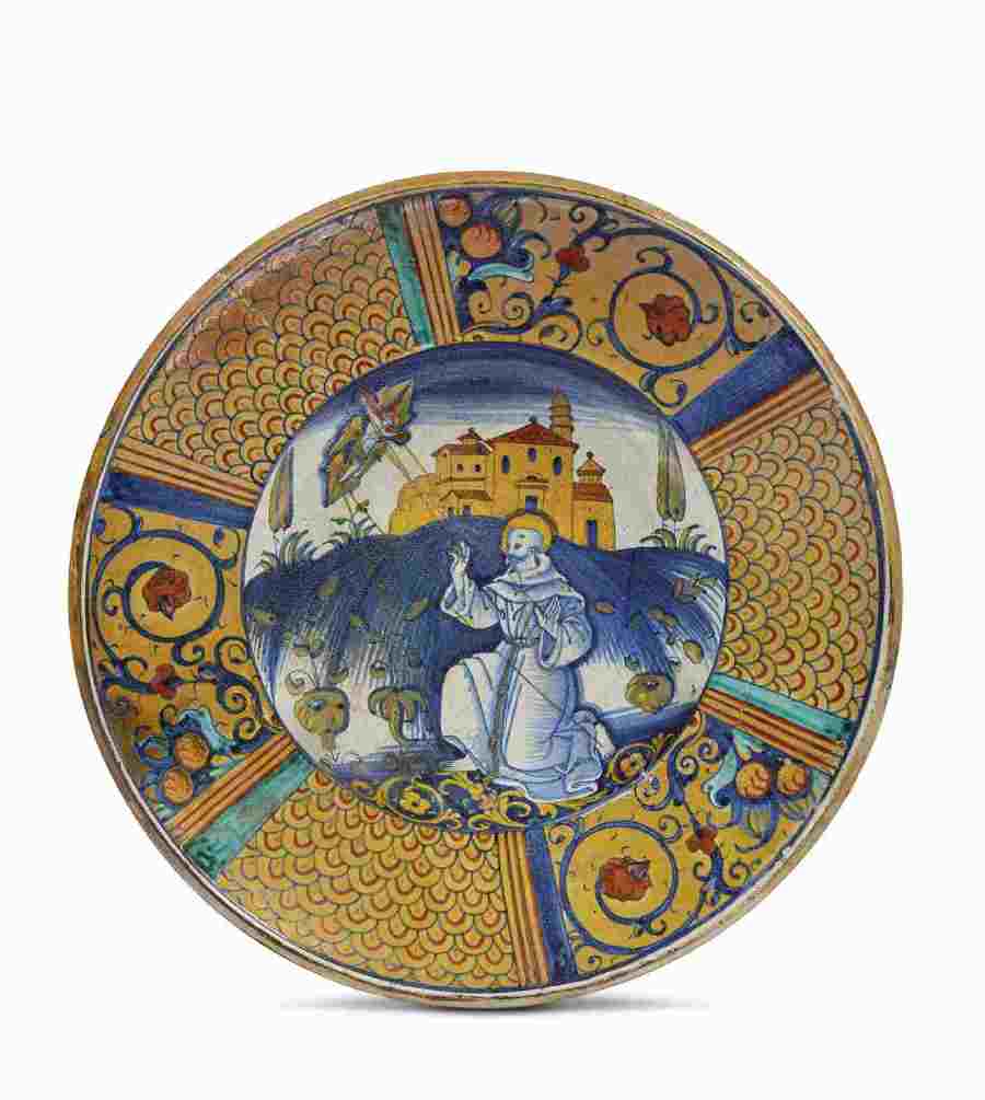 Per quanto riguarda la maiolica segnaliamo un importante piatto da parata di Deruta realizzato intorno al 1530, nella tipica forma dei piatti da pompa, ossia con un’ampia tesa obliqua decorata a riserve che alternano girali fiorite ad altre dal peculiare motivo a embricazion, e un cavetto largo e profondo ove è illustrata la scena di San Francesco che riceve le stimmate. Il piatto, che presenta una decorazione tipica per questa tipologia e che ritroviamo in altri importanti esemplari come quello conservato nel Museo di Cleveland, è in proposto a 5.000/7.000 euro.