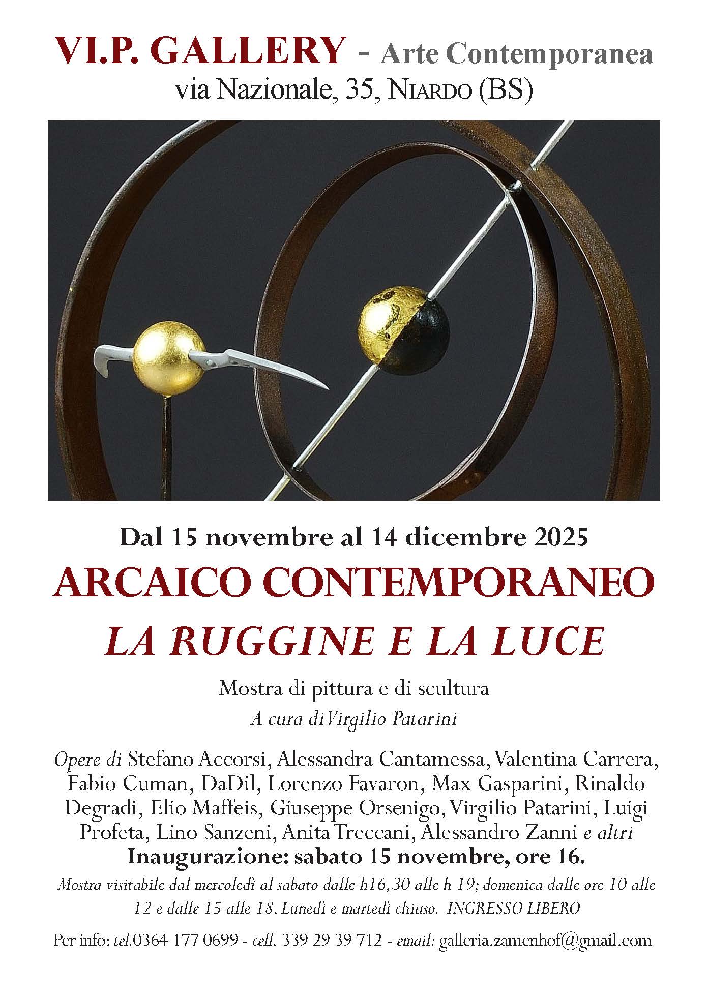 Dopo il successo di pubblico e di critica dei primi tre eventi, si inaugura sabato 15 novembre alle ore 16 alla Vi.P. Gallery Valcamonica, in via Nazionale, 35, a Niardo (BS) la prima mostra tematica della stagione intitolata Arcaico Contemporaneo: la ruggine e la luce, una grande rassegna di pittura e scultura che vede in mostra, nei 200 mq della galleria camuna che si affaccia sulla Concarena, ottanta opere di quindici autori, in un equilibrato mix tra artisti affermati e giovani emergenti, con un’ampia rappresentanza bresciana e bergamasca, selezionati dal direttore artistico e curatore Virgilio Patarini.