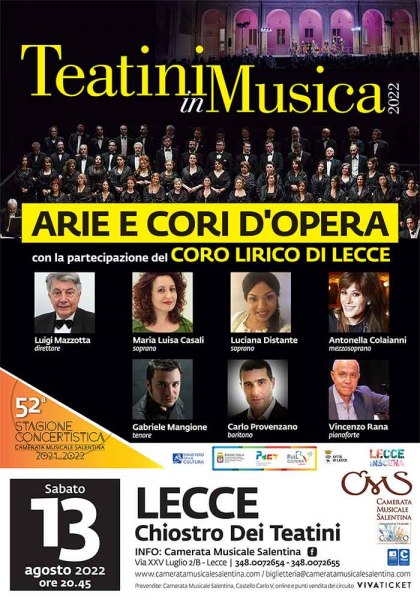 Arie e cori d'Opera è il titolo del concerto che vedrà protagonisti sul palco del Chiostro dei Teatini di Lecce i soprani Maria Luisa Casali e Luciana Distante, il mezzosoprano Antonella Colaianni, il tenore Gabriele Mangione, il baritono Carlo Provenzano, il pianista Vincenzo Rana, con la partecipazione del Coro Lirico di Lecce diretto da Luigi Mazzotta.