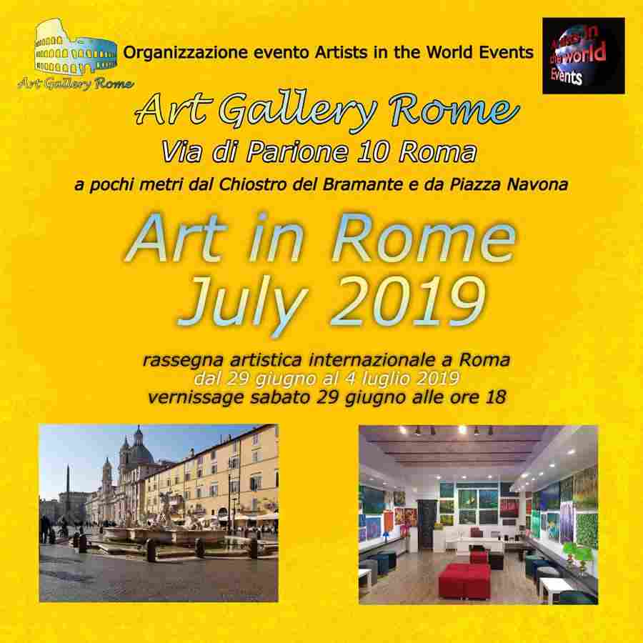 Si inaugura sabato 29 giugno alle ore 18 la grande rassegna artistica internazionale a Roma "Art in Rome July 2019", presso il nuovo elegante spazio della Galleria "Art Gallery Rome" https://www.artgalleryrome.it/ in Via di Parione 10 00186 Roma centro storico di Roma a pochi metri dal Chiostro del Bramante e da Piazza Navona.