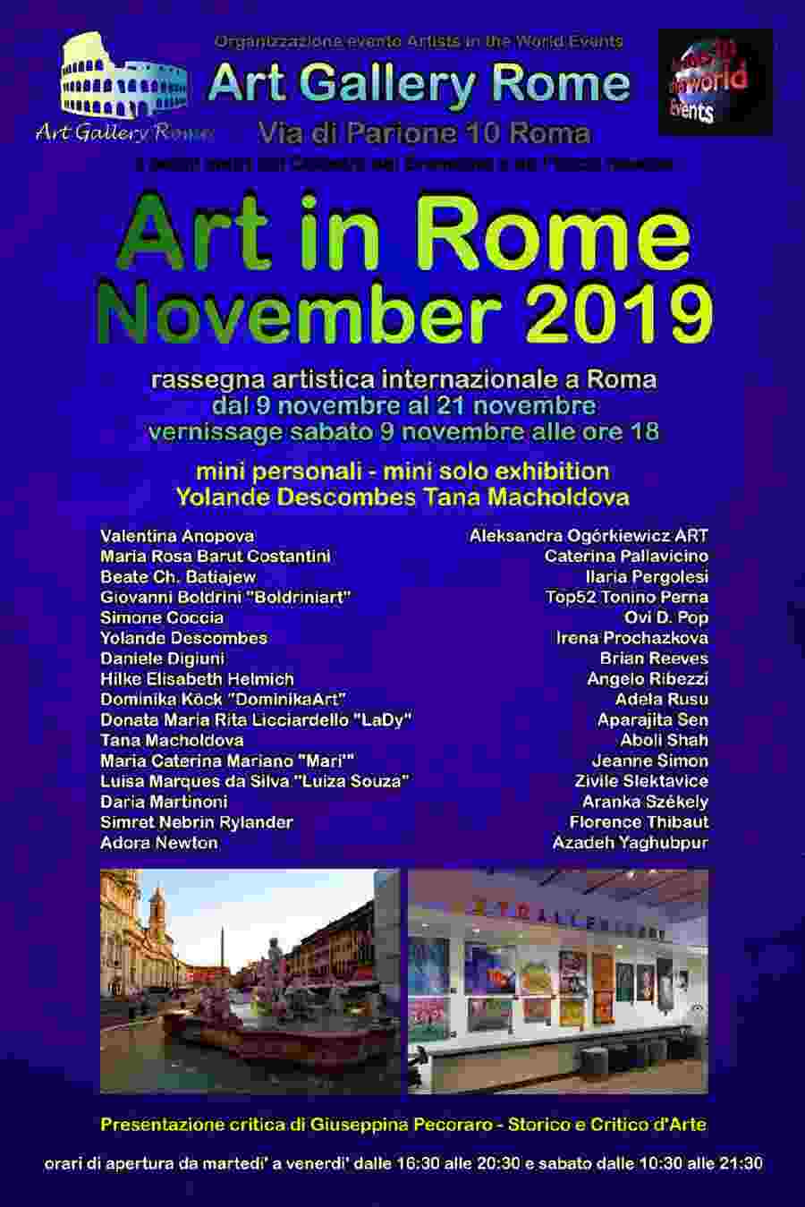 mini personali - mini solo exhibition   Yolande Descombes ; Tana Macholdova Valentina Anopova; Maria Rosa Barut Costantini; Beate Ch. Batiajew; Giovanni Boldrini "Boldriniart"; Simone Coccia; Yolande Descombes; Daniele Digiuni; Hilke Elisabeth Helmich; Dominika Köck "DominikaArt"; Donata Maria Rita Licciardello "LaDy"; Tana Macholdova; Maria Caterina Mariano "Mari' "; Luisa Marques da Silva "Luiza Souza"; Daria Martinoni; Simret Nebrin Rylander; Adora Newton; Aleksandra Ogórkiewicz ART; Caterina Pallavicino; Ilaria Pergolesi; Top52 Tonino Perna; Ovi D. Pop; Irena Prochazkova; Brian Reeves; Angelo Ribezzi; Adela Rusu; Aparajita Sen; Aboli Shah; Jeanne Simon; Zivile Slektavice; Aranka Székely; Florence Thibaut; Azadeh Yaghubpur