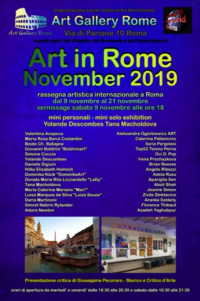 Si inaugura vernissage sabato 9 novembre alle ore 18 la grande rassegna artistica internazionale a Roma "Art in Rome November 2019", presso lo spazio elegante  della Galleria "Art Gallery Rome" https://www.artgalleryrome.it/ in Via di Parione 10 00186 Roma in centro storico di Roma a pochi metri dal Chiostro del Bramante e da Piazza Navona.