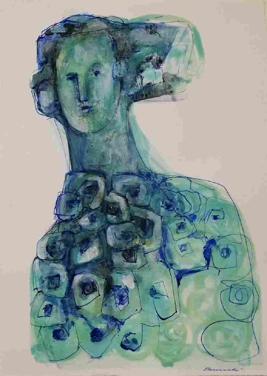 Claudia Barsacchi (LI): nata a Livorno, ma residente a San Vincenzo (sempre in provincia di Livorno), Claudia Barsacchi è artista a trecentosessanta gradi, vale a dire che la sua attività non si limita ad una sola espressione artistica, ma si articola e si irradia a varie e diversificate tecniche. Pittura, scultura e grafica sono infatti i campi in cui si cimenta raggiungendo in ognuno di essi ottimi risultati. Per questa Rassegna, però, l'artista toscana ha scelto di presentarsi unicamente come pittrice esponendo quattro opere, un olio e tre acquerelli, di grande e suggestivo effetto scenografico. Sono i suoi caratteristici personaggi, quelli che, ormai da diversi anni, fanno parte del suo mondo e del suo estro creativo. In essi si coglie la straordinaria sintesi rappresentativa dell'artista, la trasparenza e la poetica leggerezza dell'invenzione. Sono personaggi al fuori del tempo e dello spazio, creature del sogno e della mente, ma fortemente vive, presenti, evocative e dunque vere e concrete. Queste figure livide e appena suggerite, fatte solo di anima e spirito, queste forme volutamente incompiute e simili a fantasmi, portano l'osservatore verso atmosfere magiche e sospese, verso mondi misteriosi e surreali.