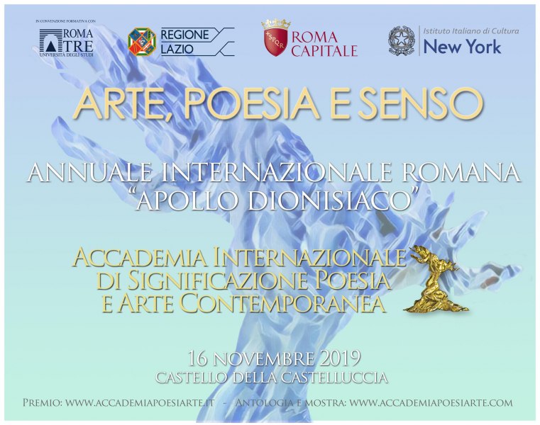 L’Accademia Internazionale di Significazione Poesia e Arte Contemporanea di Roma, polo no profit di libera creazione, ricerca e significazione del linguaggio poetico e artistico, in Convenzione formativa con l’Università degli Studi di Roma Tre e con il Patrocinio della Regione Lazio, di Roma Capitale e dell’Istituto di Cultura di New York, Presidente fondatrice la prof.ssa Fulvia Minetti, Vicepresidente il dott. Renato Rocchi, Direttore Artistico Antonino Bumbica, cerimonia il Premio Accademico Internazionale di Poesia e Arte Contemporanea “Apollo dionisiaco” sabato 16 Novembre 2018 dalle ore 16,00 presso il Salone del duecentesco Castello della Castelluccia in Roma.