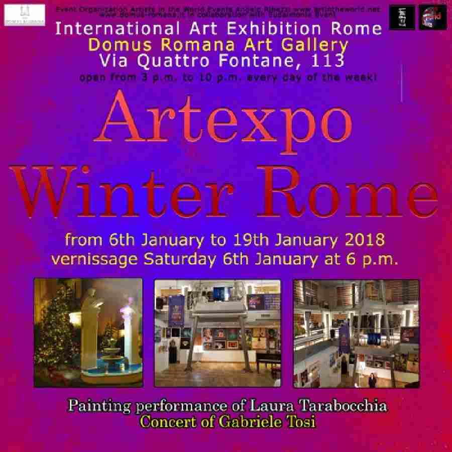 Si inaugura sabato 6 gennaio 2018 alle ore 18 la grande rassegna artistica internazionale a Roma Artexpo Winter Rome 2018, presso il prestigioso spazio della Galleria Domus Romana https://www.domus-romana.it in Via Quattro Fontane, 113 00184 Roma tra Piazza di Spagna e la Fontana di Trevi, in centro storico di Roma.