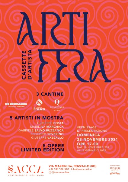 ARTIFERA è il nome di fantasia ideato per il nuovo progetto concepito dalla siciliana galleria d’arte contemporanea SACCA. Esso vedrà il via a fine novembre (il 28) e prevede il coinvolgimento di tre cantine co-finanziatrici nella realizzazione di una collezione limited edition di cassette d’artista e una mostra nella sede della galleria (a Pozzallo, nel ragusano) con opere dei cinque artisti invitati.