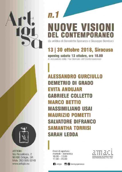 Siracusa - Sabato 13 ottobre alle ore 18 negli spazi espositivi di Artigia, atelier d'arte in Ortigia (via Resalibera 2) sarà inaugurata la collettiva dal titolo "Art-igia n. 1. Nuove visioni del contemporaneo". La mostra, nata da un'idea del linker art Benedetto Speranza e dell'artista Giuseppe Bombaci, si inserisce nel calendario degli eventi organizzati per la quattordicesima Giornata del Contemporaneo, kermesse internazionale indetta dall'Associazione dei Musei d'Arte Contemporanea Italiani (AMACI) per promuovere l'arte del nostro tempo attraverso, mostre, eventi, laboratori e aperture gratuite di musei in Italia e all'estero.