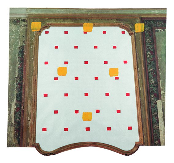 Sulla parete esterna che affaccia sul corriodio Green viene presentata l’opera Contorsions n°6 di François Morellet, artista internazionale - con cui la galleria collabora dal 1994 - cui il Centre Pompidou di Metz dedicherà nel 2026 una grande retrospettiva in occasione del centenario dalla sua nascita. Morellet da sempre decostruisce ironicamente la geometria euclidea per restituirne una rappresentazione dal segno minimale affinché si ridefiniscano i sistemi percettivi ed esperienziali del reale. I neon che sbordano dai margini del quadro - rompendone il perimetro - si realizzano nell’attivazione dello spazio circostante, estendendosi oltre il limite della tela. Espansione che raggiunge l’apice della tensione nel linguaggio espressivo di Niele Toroni, per il quale l’atto pittorico è strettamente legato con lo spazio ed il tempo dell’esistenza. La successione delle impronte di pittura è ripetuta sulle superfici più varie, in questo caso sui manifesti degli interventi dell’artista stesso realizzati nel 1987 al Castello di Rivoli.