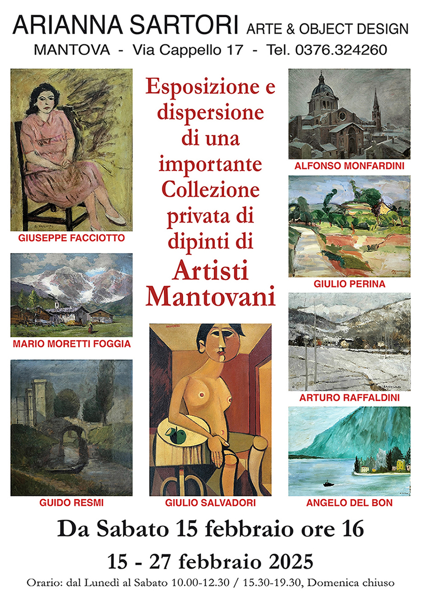La Galleria Arianna Sartori di Mantova, nella sala di via Cappello 17, Sabato 15 febbraio alle ore 16.00, espone per la dispersione una raccolta di dipinti di Maestri Mantovani provenienti da una importante Collezione Privata. In mostra sono esposte opere degli Artisti: Mario Moretti Foggia, Alfonso Monfardini, Guido Resmi, Angelo Del Bon, Arturo Raffaldini, Giuseppe Facciotto, Giulio Perina, Giulio Salvadori.