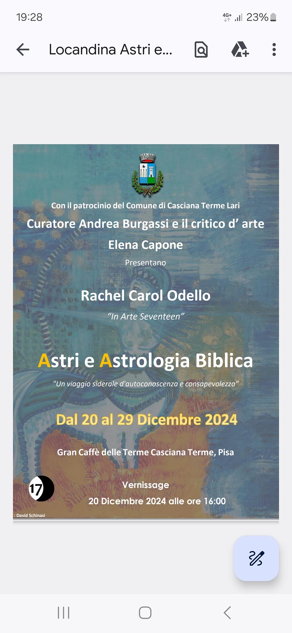 Inaugura venerdì 20 dicembre 2024, alle ore 16.00, presso il Gran Caffè delle Terme nel Comune di Casciana Terme Lari (PI), la mostra di pittura “Astri e Astrologia Biblica”, che indaga i messaggi astrali in chiave biblica, di Rachele Carol Odello (in arte “Seventeen”), a cura di Andrea Burgassi e Elena Capone e con il patrocinio del Comune.