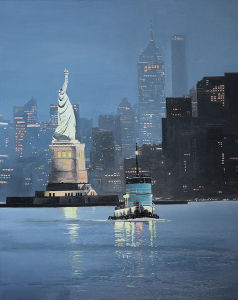 E' successo qualcosa, e qualcosa deve ancora accadere. Ma cosa? Ombre lunghissime e sfumate, scie chimiche, linee d'orizzonte mostrano una attesa incerta, ma comunque, tranquillizzante come l'azzurro pastello che fa da sfondo all'opera.
