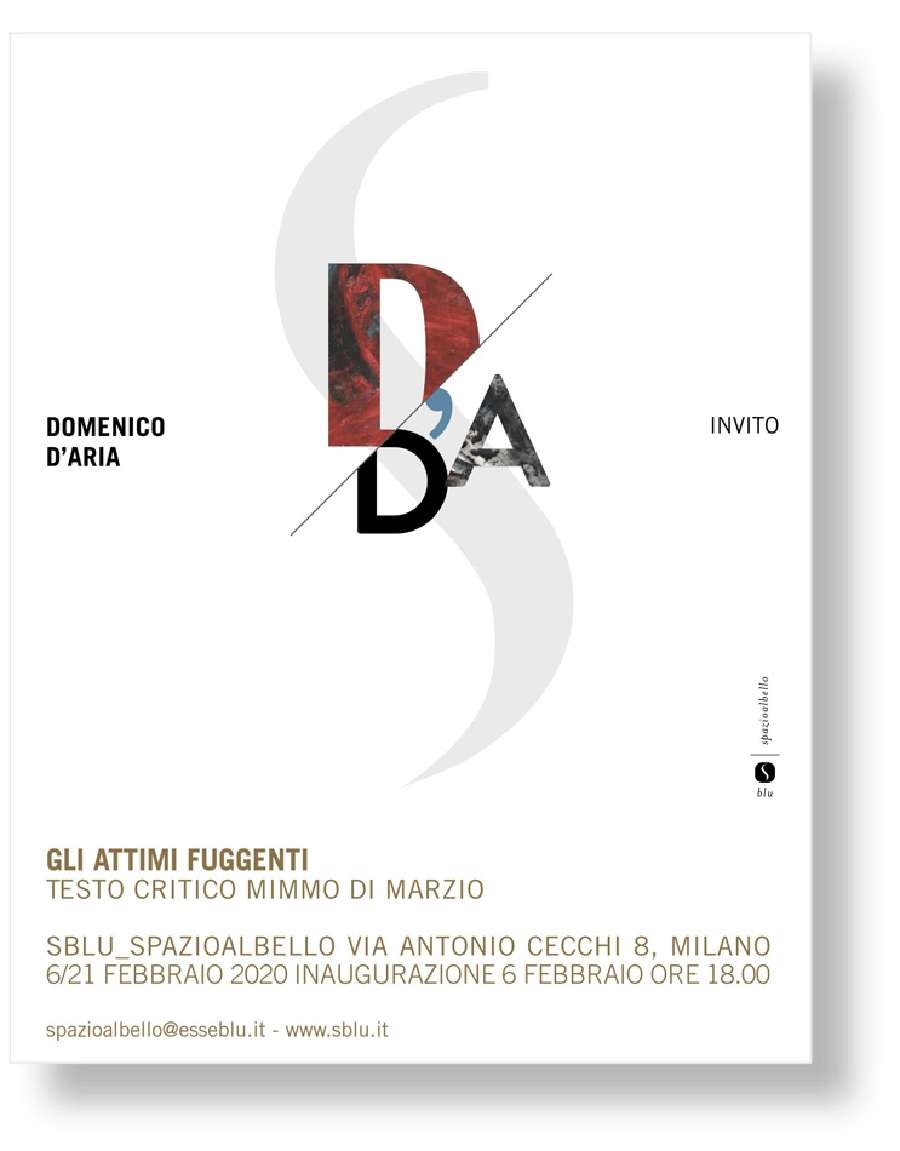 La ricerca artistica di Domenico D’Aria sviluppa una poetica dove la spontaneità del gesto, che si fa segno grazie alla materia, si trasforma in energia pura. Vicina all’arte informale la sua pittura non rifiuta la forma, ma definisce l’immagine attraverso un’azione carica di furore drammatico. Artista legato alla sua terra - il Salento – D’Aria contrappone la solidità della materia all’energia della luce, in una dialettica tra gli opposti che fissa lo spazio pittorico nella costante ricerca dell’origine. Nelle sue opere sembra prevalere il caos generato dall’esplosione di materia e colore sotto la sferzata di segni costanti, che si ripetono come ferite profonde impossibili da rimarginare. Eppure proprio quelle ferite, come descrive Mimmo Di Marzio nel suo saggio di presentazione della mostra, diventano:”alfabeti ancestrali che segnano indelebilmente il centro della tela, paiono risucchiare come buchi neri l’idillio cosmico e la sua luce, evocando antiche memorie di spazi, più mentali che fisici”. In mostra l’artista propone opere su carta definite dal magma di pigmento puro, carta, sabbie, ceneri e gli ultimi lavori a olio dominati dal colore, sempre più essenziale e primario, al limite della monocromia in contrapposizione al nero, che impetuosamente solca lo spazio.