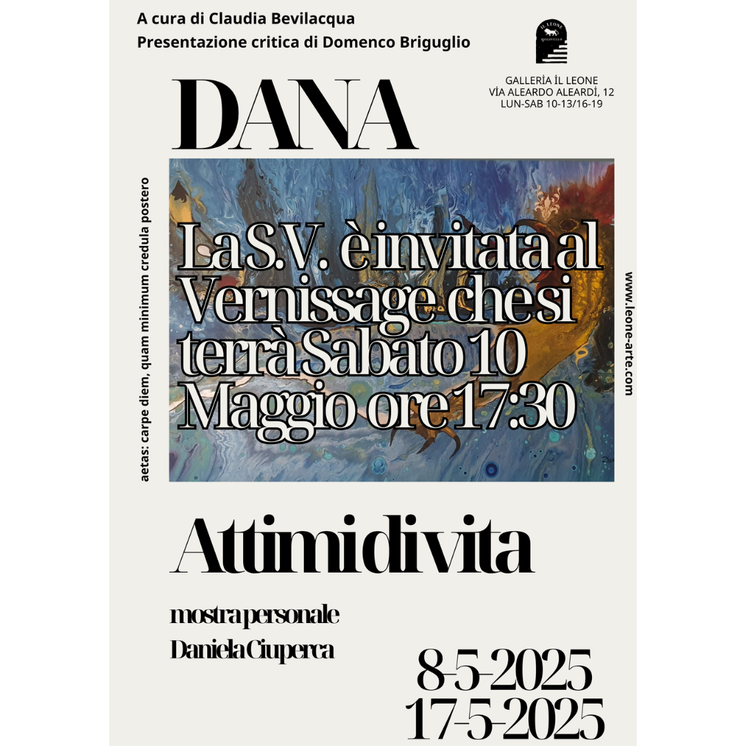 Verrà inaugurata Sabato 10 Maggio ore 17:30 nei nostri locali di via Aleardo Aleardi 12, Roma, la mostra "Attimi di vita", personale di DANA (Daniela Ciuperca) curata da Claudia Bevilacqua con presentazione critica di Domenico Briguglio.