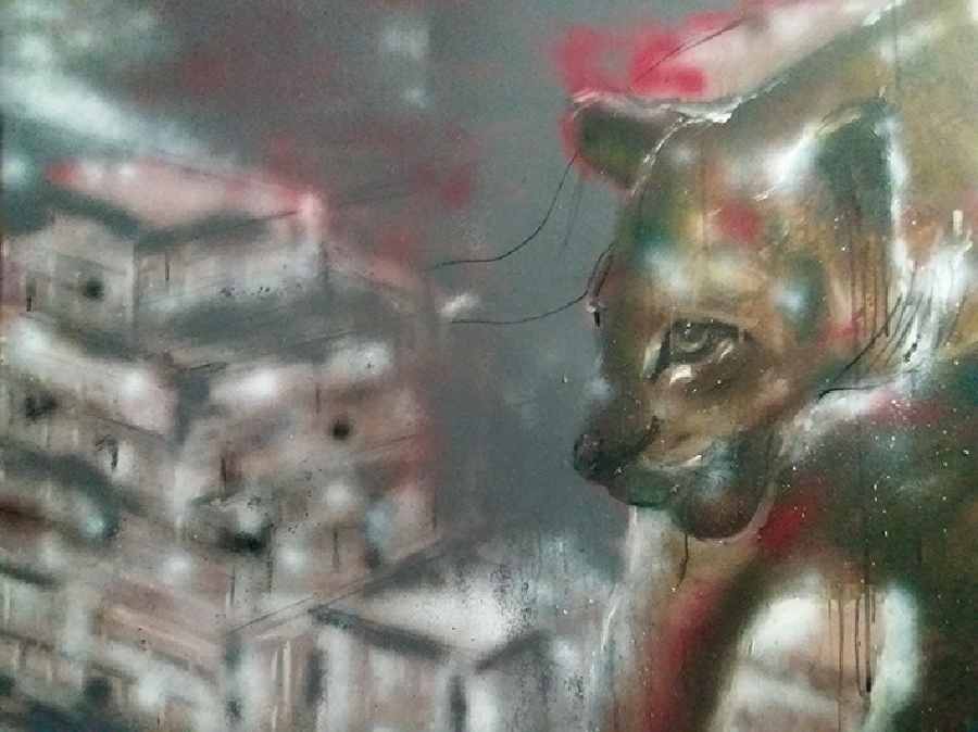 L’uomo e la bestia si confondono, si mescolano, si contendono la scena. Entrambi condividono uno stesso dentino e una stessa sensibilità con l’unica differenza che non I’habitat animale, ma la casa dell’uomo, come un cancro, si e moltiplicata a dismisura fagocitando territori della mente. L’occhio dell’animale dell’uomo sono come persi nel vuoto. L’espressione è quasi interrogativa e stimola l’osservatore a porsi delle domande. I personaggi é come se entrassero improvvisamente nella tela del pittore. Sembrano catturati nel corso di una sequenza cinematografica. Le figure, dai contorni volutamente più o meno incerti, come fotografie mosse azionano il desiderio di capire a quale storia appartenga il frame proposto. È un pasto appena consumato, come il quadro del leone che si muove sovrastando la città? È la fuga da un fantomatico zoo, come il ritratto dello scimpanzé?