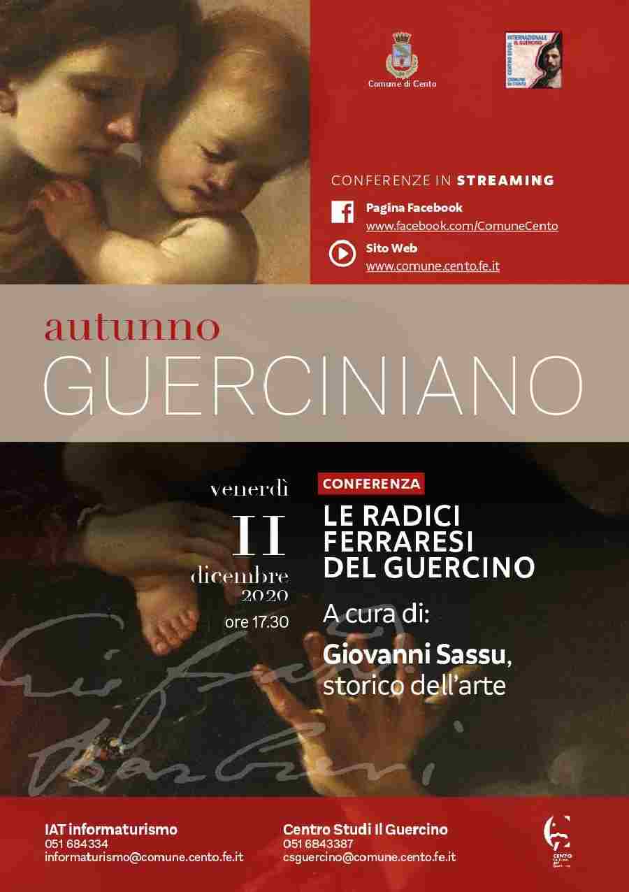 Dall’11 dicembre 2020 all’11 febbraio 2021 il Comune di Cento e il Centro Studi Internazionale il Guercino promuovono una serie di appuntamenti culturali nell’ambito della rassegna annuale “Autunno Guerciniano”. Dopo il grande successo della mostra “Emozione Barocca. Guercino a Cento” alla Pinacoteca San Lorenzo e alla Rocca di Cento, proseguono gli eventi dedicati all’artista Giovanni Francesco Barbieri, detto Guercino (1591-1666). Cento rende ancora una volta omaggio al suo cittadino più illustre, nella città che gli ha dato i natali e che mai ha smesso di amare. Nonostante le restrizioni imposte dall’attuale emergenza sanitaria, la cultura non si ferma ma diventa strumento di emancipazione sociale anche a distanza grazie all’utilizzo delle nuove tecnologie che consentono di fruire dei vari appuntamenti in modalità streaming video, comodamente da casa propria. La rassegna “Autunno Guerciniano 2020-2021” si pone l’obiettivo di promuovere e valorizzare il patrimonio culturale lasciato in eredità dal Guercino, uno degli artisti più conosciuti e apprezzati del ‘600.