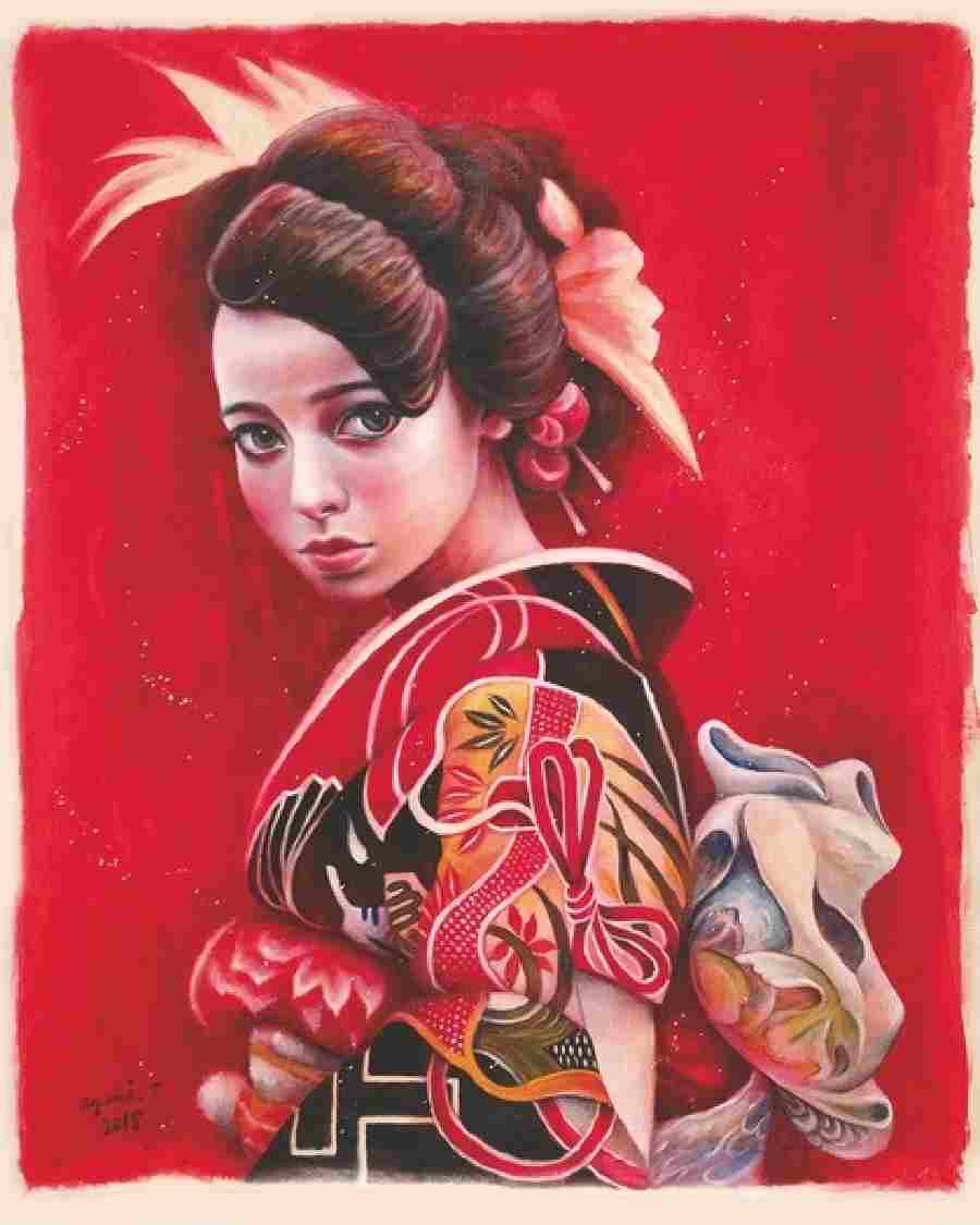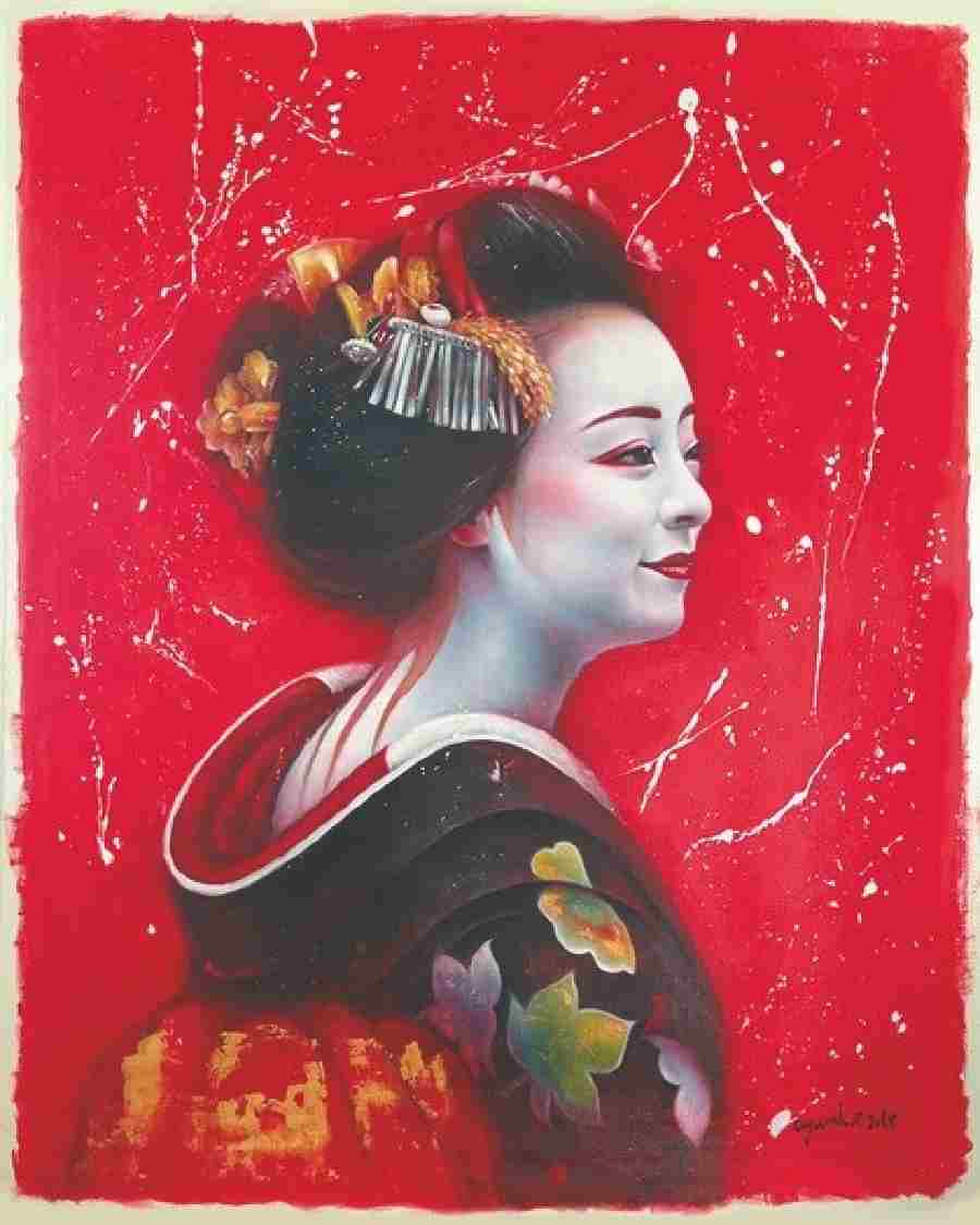 «La definizione calligrafica dei volti – si legge nel testo di Chiara Serri – così come la resa volumetrica dei corpi, delle acconciature e dei kimono, sembra contrastare con la stesura dei fondi, monocromi (spesso color porpora) o d’invenzione, in cui si riconosce traccia di un gesto rapido e deciso, teso ad annullare ogni riferimento spazio-temporale. Il passato diventa presente e la figura della Geisha si sovrappone a quella della danzatrice del Kabuki originario, così come alla Kabuki Girl di Ayumi Sasaki, sinonimo di una giovane donna che, come dichiara la stessa artista, può liberare la creatività e realizzare le proprie aspirazioni. Senza limiti, senza vincoli, oltre gli stereotipi e le imposizioni sociali».
