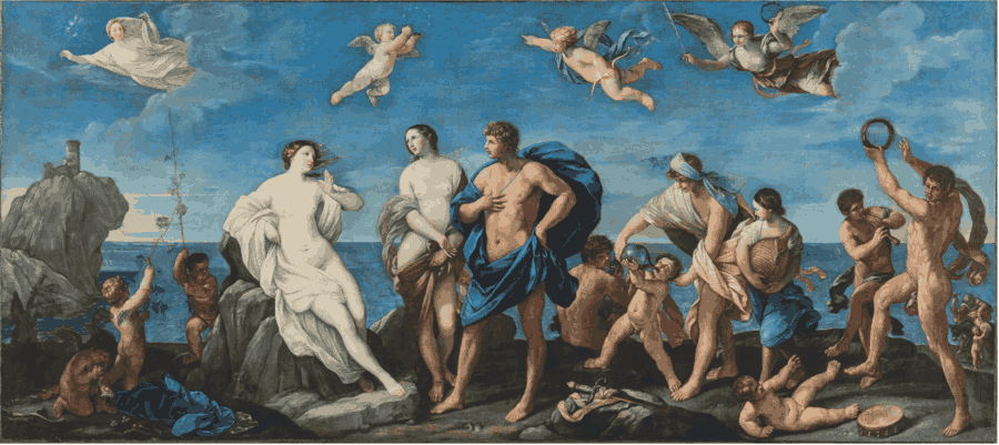 La complessa vicenda ha inizio nel 1637, con la commissione di Papa Urbano VIII e del cardinale nipote Francesco Barberini a Guido Reni delle Nozze di Bacco e Arianna, ambiziosa opera di imponenti dimensioni, da recapitare alla cattolica Enrichetta Maria di Borbone, moglie del Re d’Inghilterra Carlo I Stuart. La composizione doveva ritrarre il mito antico delle vicende di Arianna che, perduto Teseo sulla spiaggia deserta di Nasso, assiste al sopraggiungere di Bacco, introdotto da Venere e accompagnato dal consueto corteo. L’opera, destinata a ornare il soffitto della camera da letto della Regina, era un omaggio nuziale per riallacciare i rapporti diplomatici in vista di riguadagnare terreno per la causa cattolica nell’Inghilterra anglicana, volendo rappresentare una sorta di allegoria di una ritrovata comunione religiosa tra l’Inghilterra e la Chiesa di Roma.