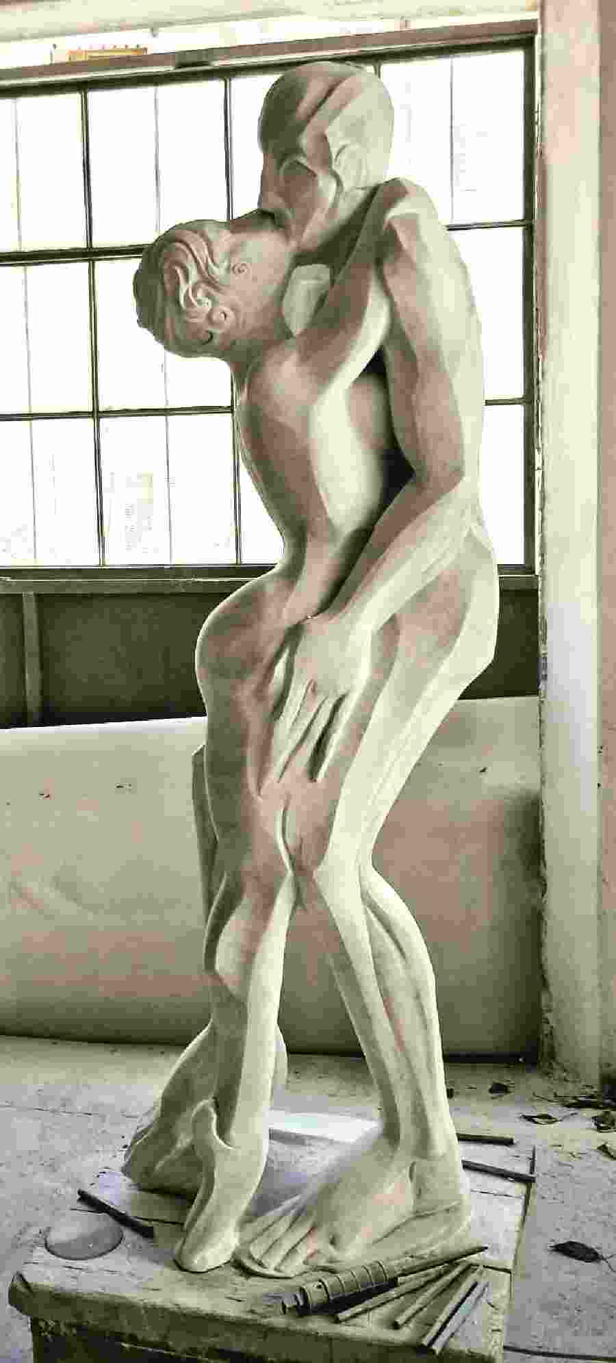 Per Michelangelo il bacio è un qualcosa di spontaneo e, al contempo, di universale. Con sguardo meravigliato mi dice che nessuno ce lo ha insegnato ed è vitale per costruire legami di intimità, essenziali per le umane relazioni. Mentre la scultura, trasmessa dal sangue paterno, la sente come un’emozione che prende forma e gli dà quella consapevolezza di vivere il presente così come gli permette di concentrarsi, istante dopo istante, nell’esperienza scultorea rinforzando, in questo modo, la sua capacità di prestar attenzione a quello che fa per forza di levare e l’impegno di prendersi cura dell’opera una volta ultimata.