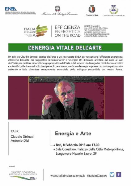 A ingresso libero, giovedì 8 febbraio 2018 dalle 17.30 il talk è organizzato da ENEA, Comune e Città Metropolitana di Bari, ed è uno degli appuntamenti del "Road Show dell'Efficienza Energetica". Prima Campagna di informazione itinerante, in 10 città nell’arco di 5 mesi, organizzata dell’Agenzia Nazionale per l'Efficienza Energetica dell'ENEA. Partendo da Bolzano per arrivare a Palermo, passando per Torino, Ferrara, Ascoli Piceno, Viterbo, Napoli, Matera e Bari ogni territorio può fare dell’efficienza energetica non solo un’opportunità di riduzione dei costi, ma anche di sviluppo tecnologico, economico e culturale e di vera rigenerazione urbana.