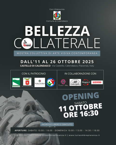 Con “Bellezza Collaterale”, l’Associazione Luci & Ombre conferma la propria missione: valorizzare artisti e opere contemporanee in un contesto di grande fascino storico, trasformando Calendasco e la provincia di Piacenza in un polo di turismo culturale e di riflessione condivisa.