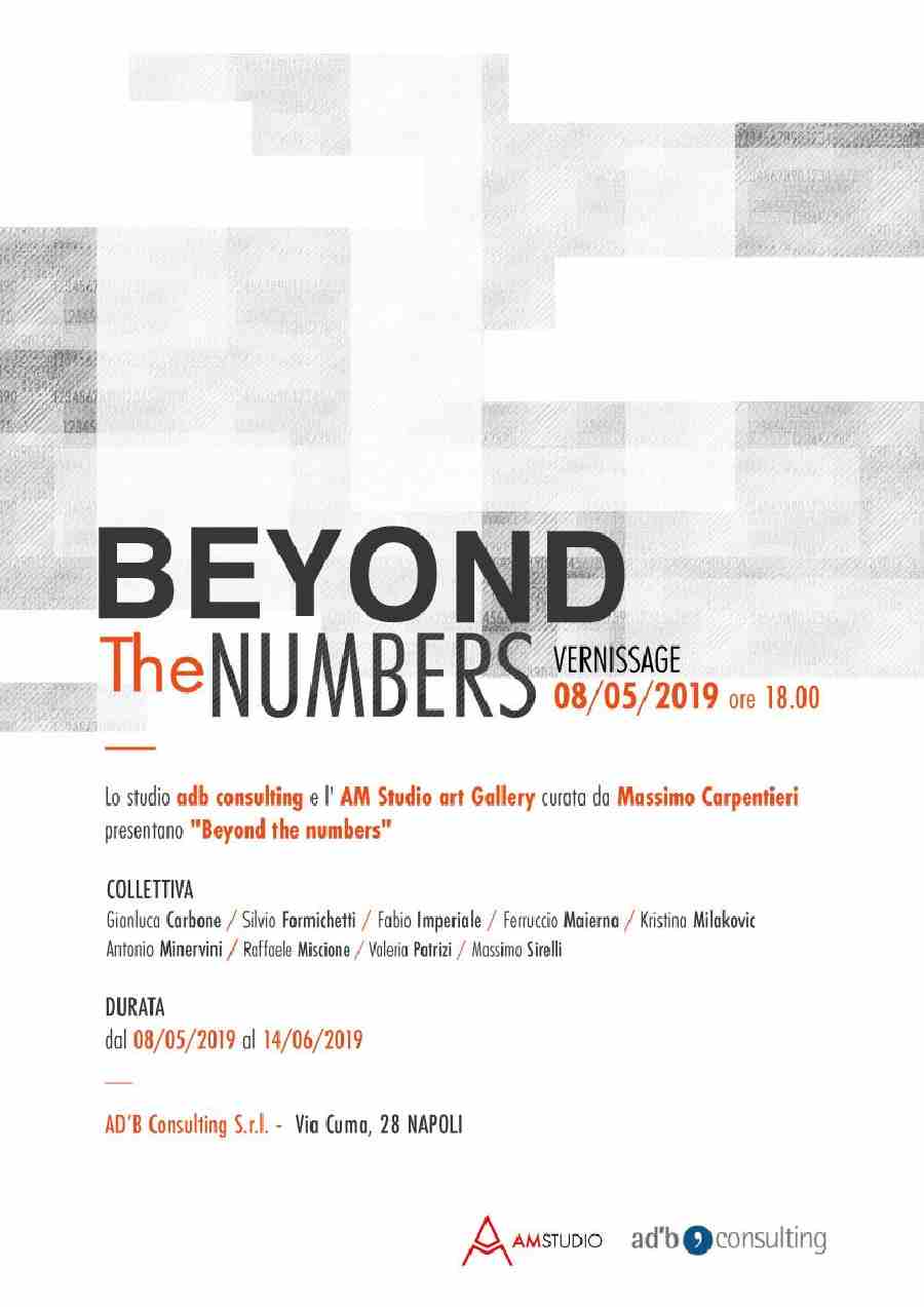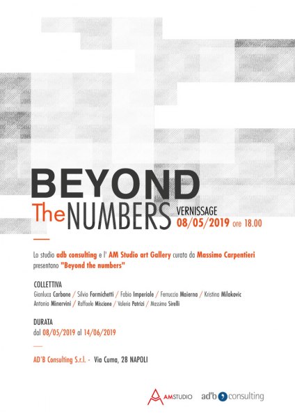 Protagonisti dell’evento: Gianluca Carbone, Silvio Formichetti, Fabio Imperiale, Ferruccio Maierna, Kristina Milakovic, Antonio Minervini, Raffaele Miscione, Valeria Patrizi, Massimo Sirelli. AD’B Consulting, studio di commercialisti, apre dunque i suoi spazi alla città sulla scorta di un sodalizio artistico con AM Studio, la galleria vomerese diretta da Antonio Minervini che a un anno e più dalla sua apertura ripropone una condivisione di spazi tra arte e attività eterogenee. Beyond the numbers raccoglie artisti con esperienze e modalità espressive differenti, che interpretano, ognuno con la propria cifra stilistica, il passaggio dei nostri tempi. Oltre la ragione, la logica, i risultati, c’è la visione di un uomo contemporaneo, poliedrico ed eclettico, ma soprattutto vivo.«Dalla pittura alla scultura, cambiano le metodologie e l’approccio alla materia – spiega Massimo Carpentieri - ma il concetto, che va ben oltre la logica dei numeri, si ripete costantemente. È sempre l’uomo e la sua percezione della realtà al centro dell’indagine visiva. Dal cromatismo informale di Miscione all'astrattismo gestuale di Formichetti, dall’astractura lineare di Minervini al figurativo onirico di Milakovic, ai volti e figure di Imperiale e Patrizi, sino al pop visionario di Carbone, i robottini di Sirelli e l’incontro metafisico di Maierna, Beyond the numbers non segue uno schema, è al di fuori delle cellette matematiche della ragione, è molteplicità espressiva dell'uomo con l'arte».