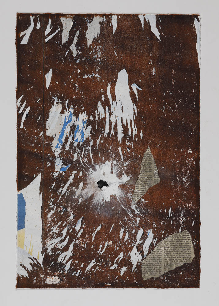 Compie quindi una sorta di allegoria fotografica attraversando lo scatto, forandolo, intervenendo manualmente, cercando in quei buchi una speranza di ritrovare l’amore e la creatività inghiottiti dagli stessi attraverso delle spinte propulsive date da casuali e spontanei interventi pittorici che conducono verso una ricostruzione della bellezza ad indicare un’esplosione di lampi di luce e chiarore nel caos dell’universo per illuminare l’oscurità.