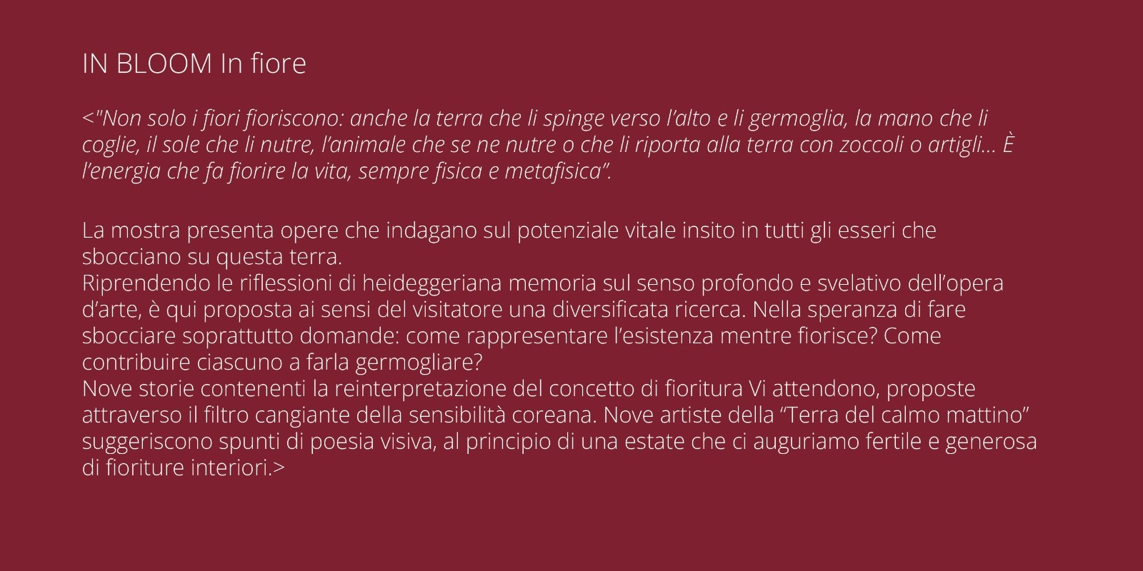 Nove storie contenenti la reinterpretazione del concetto di fioritura Vi attendono, proposte attraverso il filtro cangiante della sensibilità coreana. Nove artiste della “Terra del calmo mattino” suggeriscono spunti di poesia visiva, al principio di una estate che ci auguriamo fertile e generosa di fioriture interiori.>