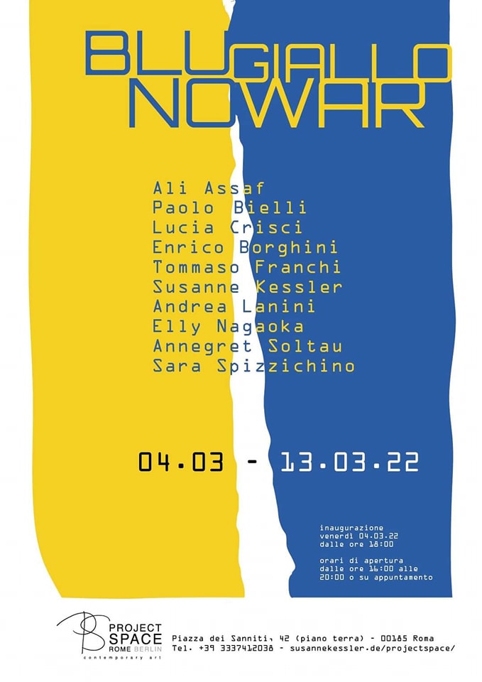 Venerdì 4 marzo 2022 inaugura presso Project Space Roma la mostra Blu/Giallo No War con le opere di Ali Assaf, Paolo Bielli, Lucia Crisci, Enrico Borghini, Tommaso Franchi, Susanne Kessler, Andrea Lanini, Elly Nagaoka, Annegret Soltau, Sara Spizzichino, a cura di Susanne Kessler: un invito che Susanne ha rivolto a diversi artisti di diverse provenienze per dire, con forza, NO alla guerra.