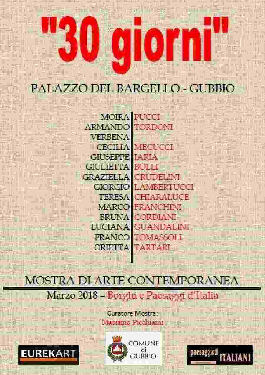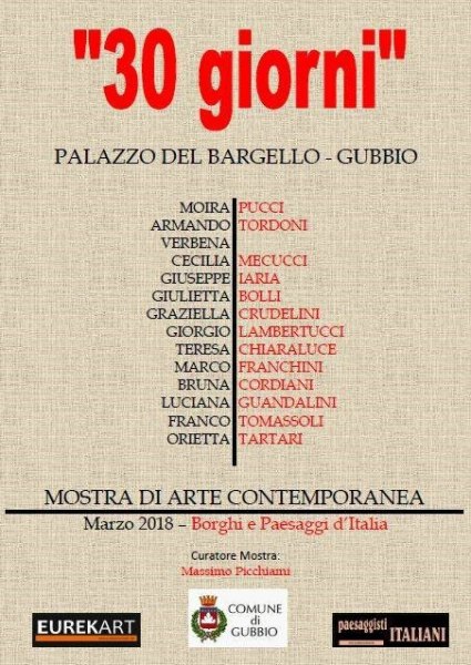 La mostra organizzata da Eureka Eventi d'Arte dal Dott.re Massimo Picchiami (Roma) e dalla Dott.ssa Elisa Urso Direttrice di Art Academy Artelis (Reggio Calabria) vede come protagonisti artisti paesaggisti provenienti da tutta Italia in una splendida esposizione di opere che rappresentano borghi e luoghi di elevata bellezza. Scelti non a caso questi 14 straordinari artisti esporranno proprio a Gubbio una tra le più belle location italiane. Saranno presenti le opere di: Moira Pucci, Armando Tordoni, Verbena, Cecilia Mecucci, Giuseppe Iaria, Giulietta Bolli, Graziella Crudelini, Giorgio Lambertucci, Teresa Chiaraluce, Marco Franchini, Bruna Cordiani, Luciana Guandalini, Franco Tommasoli, Orietta Tartari.