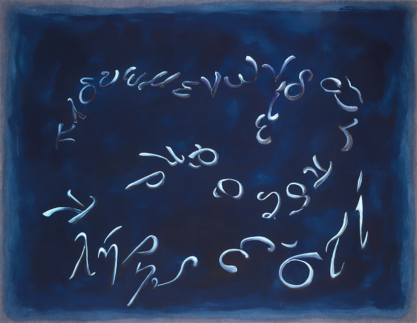 “La parola poetica assume nell’arte di Mangiaterra diverse declinazioni: è una parola performativa sul piano segnico e semantico, diventa lucido oggetto, concreto, talvolta nomina, altre evoca o interroga. Spesso l’artista usa l’alfabeto greco, le lettere levitanti dipinte o tracciate con il neon - come quello che ci accoglie nell’atrio della Casa Museo Licini - sono frammenti viventi delle nostre origini, ci riportano alla fase aurorale del pensiero quando la conoscenza avveniva nella forma del mito o dell’intuizione lirica” scrive Daniela Simoni.