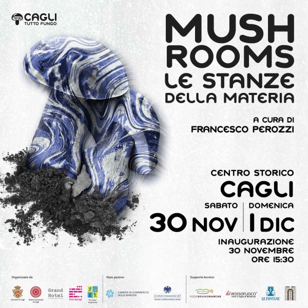 La mostra d’arte contemporanea “MUSH-ROOMS, le stanze della materia è una metafora perfetta per il ruolo che il fungo svolge in questa narrazione. Il micete è un organismo straordinario che crea innumerevoli viaggi possibili, in perfetta analogia con il meccanismo mentale che può scaturire di fronte all’opera d’arte, la quale permette di sfiorare il mistero senza abbandonare spazio e tempo presenti. Il curatore Francesco Perozzi ha invitato 20 artisti mid-career ed emergenti, capaci di aprire porte verso nuove prospettive. La selezione è stata guidata dagli elementi essenziali che caratterizzano la vita di questo affascinante organismo vivente: l’acqua, l’aria e la terra. Venti opere riprodotte in grandi dimensioni per creare un percorso en plein air nel centro storico di Cagli, trasformando la cittadina in un museo a cielo aperto per 48 ore. Gli artisti: Angelo Bellobono, Thomas Cesaretti, Edoardo Cialfi, Michele Cotelli, Eleonora Cutini, Filippo Forlani, Andrea La Rocca, Edoardo Loi, Megx, Nevio Mengacci, Ernesto Morales, Arianna Pace, Simona Pavoni, Alicya Ricciuto, Elena Ricciuto, Teresa Satta, Michele Alberto Sereni, Paola Tassetti, Alex Urso, Ricardo Aleodor Venturi.