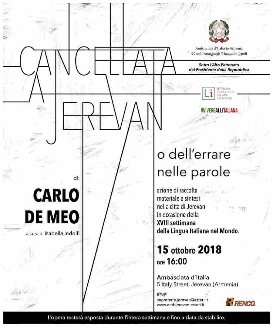 Sotto l'Alto Patronato del Presidente della Repubblica e in occasione della XVIII Settimana della Lingua Italiana nel Mondo (15 - 21 Ottobre 2018), l’Ambasciata Italiana di Jerevan invita Carlo De Meo a realizzare un progetto inedito che prenderà forma dall’errare dell’artista attraverso le pieghe della città.