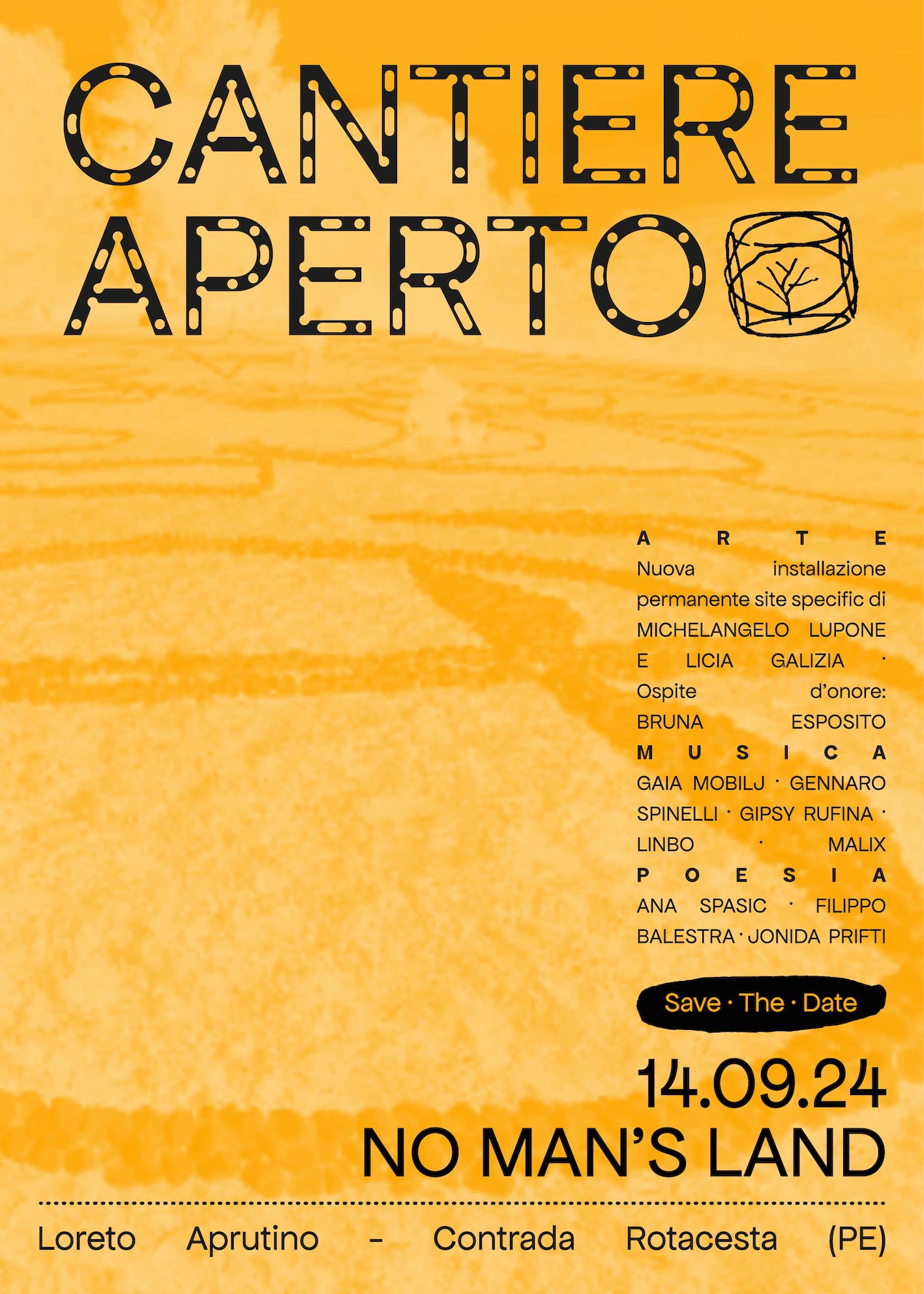 Sabato 14 settembre, dalle ore 12 alle 18, si rinnova l’appuntamento a No Man’s Land in contrada Rotacesta di Loreto Aprutino (Pe) per la seconda edizione di Cantiere Aperto, la rassegna di arte contemporanea, musica e poesia promossa dalla Fondazione No Man’s Land a cura di Zerynthia - Associazione per l’Arte Contemporanea OdV in collaborazione con Aware - Bellezza Resistente, con il Patrocinio del Comune di Loreto Aprutino.