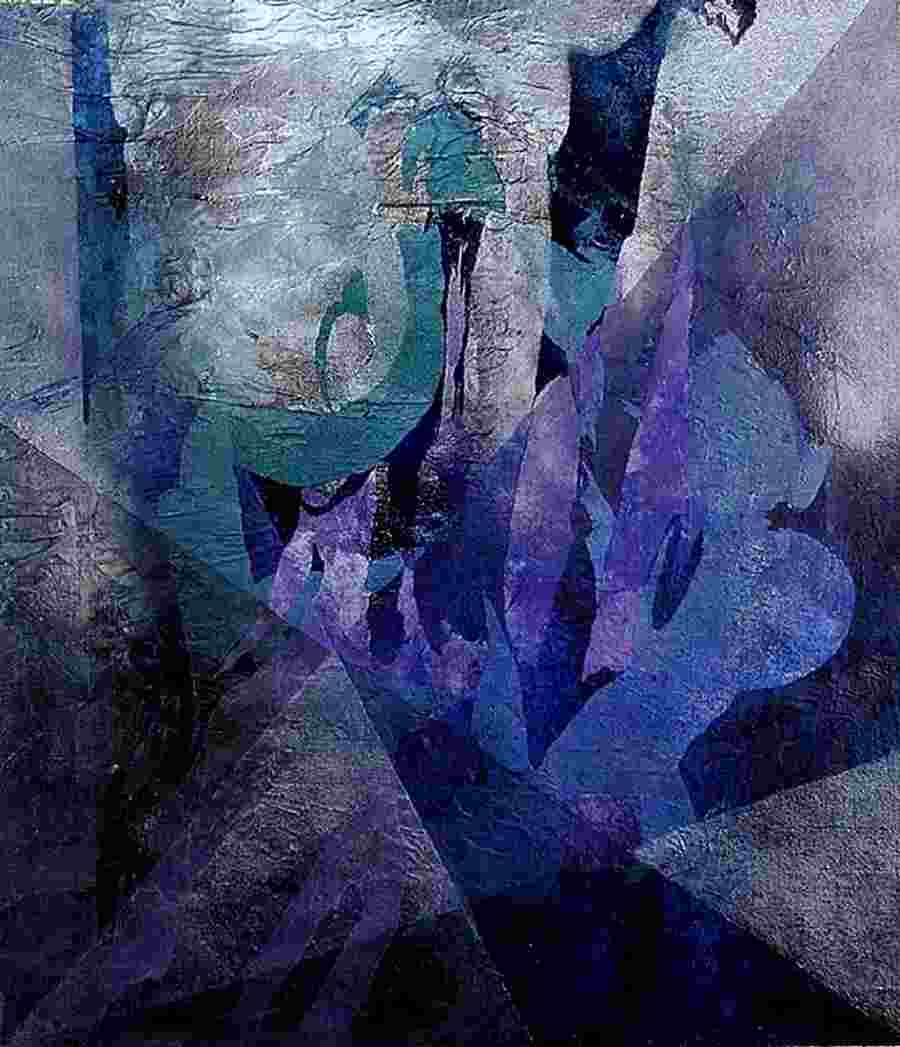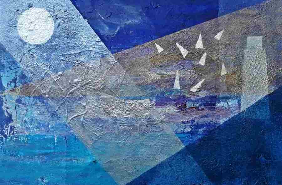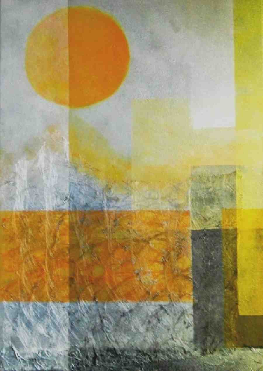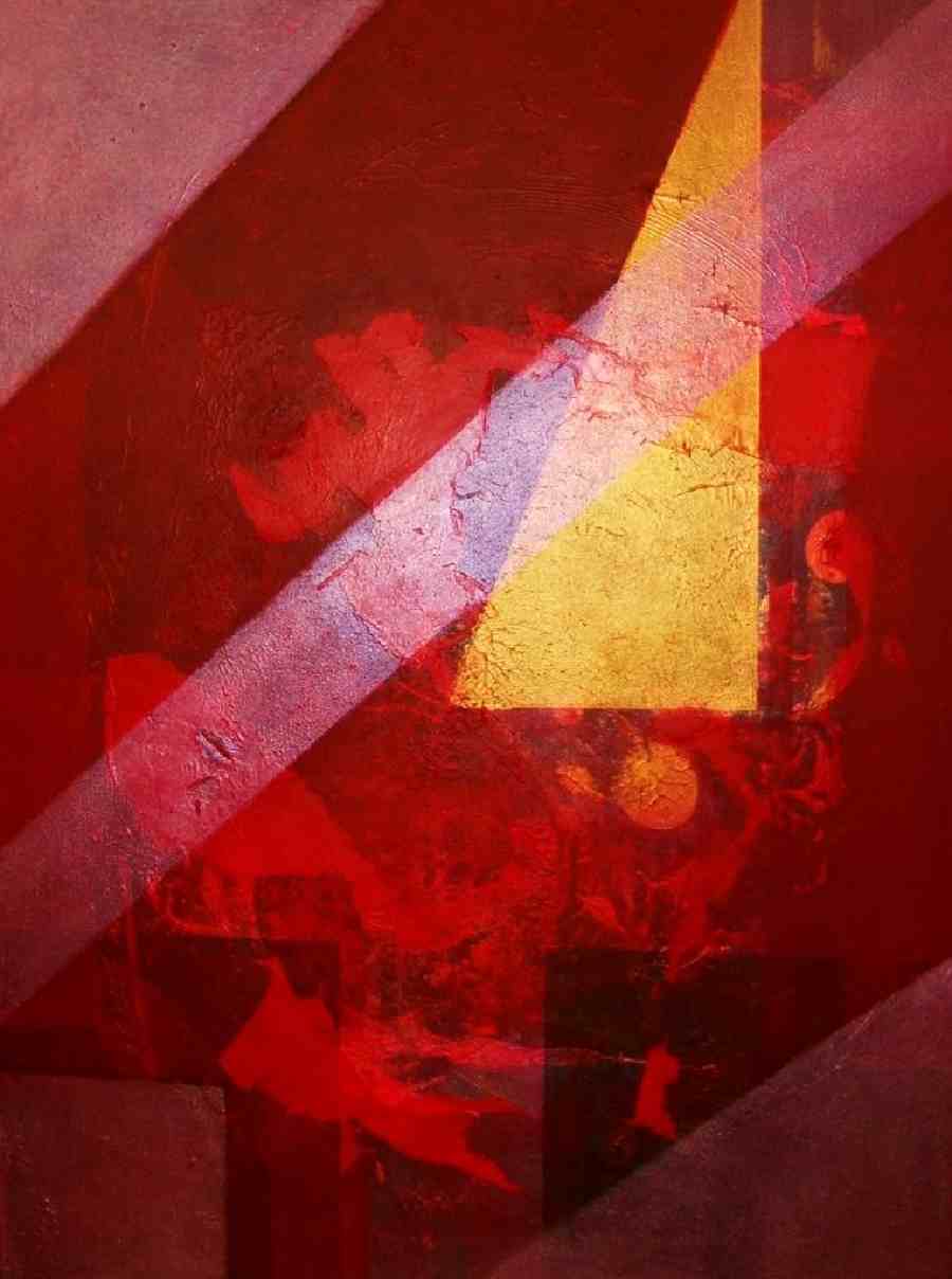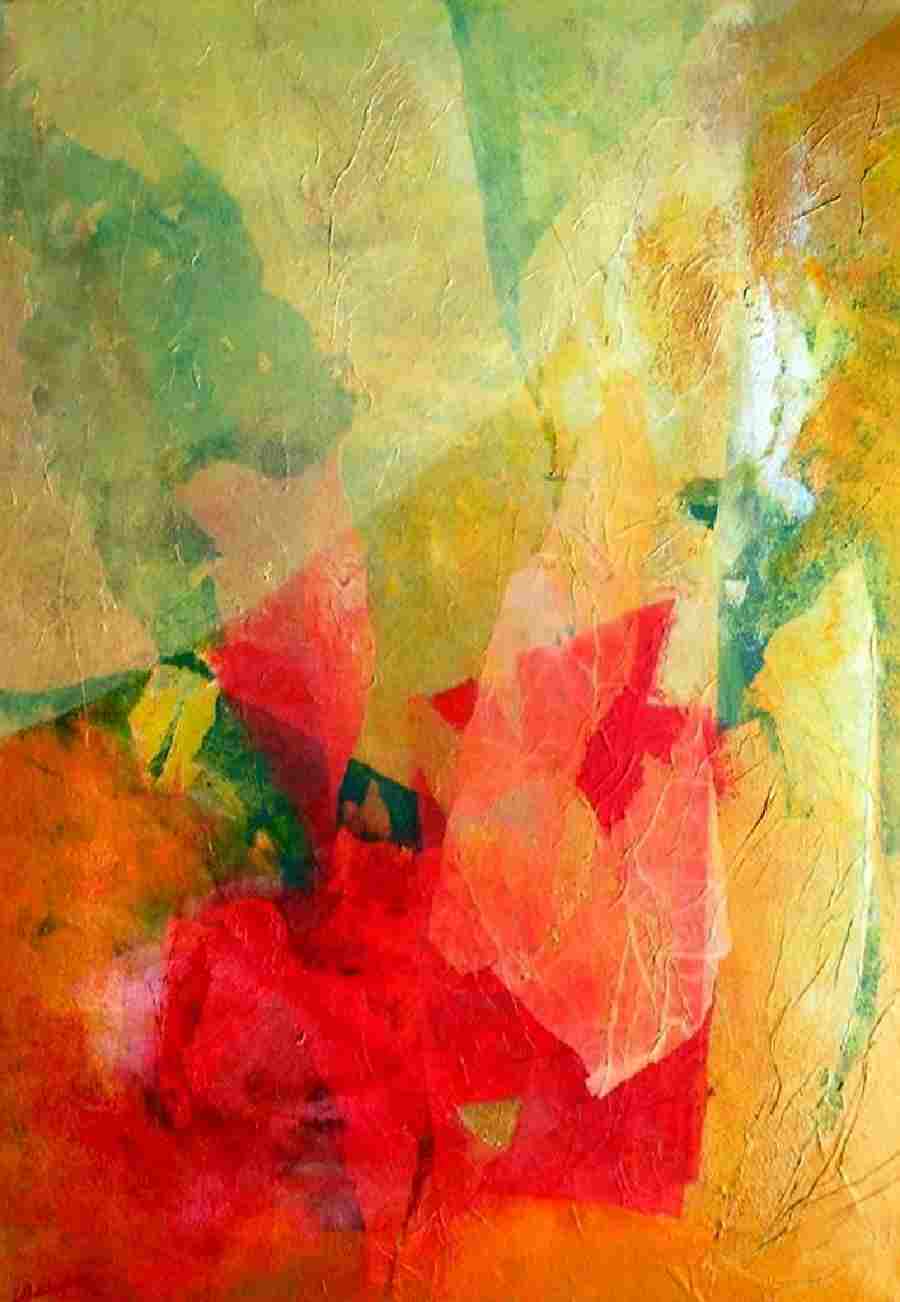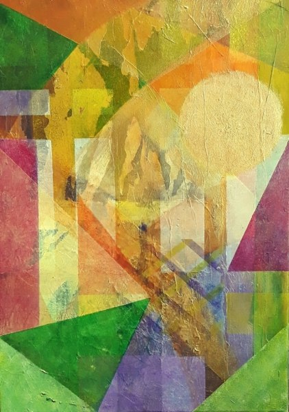 Interessante e coinvolgente, poi, l’ultima produzione dell’artista che, con un ulteriore scatto di fantasia e creatività, ha dilatato le forme e i tracciati, ampliato le visioni e gli spazi creando un Unicum visivo dove Astratto geometrico e Informale sembrano convivere in modo assolutamente naturale ed armonico. Ecco allora che in queste opere la linea e la costruzione geometrica sembrano di colpo interrompersi dando luogo ad una interessante ed imprevedibile metamorfosi segnica che si trasforma in pura riflessione cromatica dove tutto è luce e colore, vibrazione e profondità. In questi casi anche la materia utilizzata diventa morbida e pastosa e sugli sfondi si aprono improvvisi squarci di luce, fluttuanti e morbide pennellate, spontanee ed eleganti cascate cromatiche. Tutto, insomma, in questa bravissima artista, è luce e colore, e tutto si svolge e si risolve in una gradualità di toni e semitoni, di tinte calde e fredde, chiare e scure, che catturano l’osservatore per immergerlo in una dimensione che spesso diventa irreale, letteralmente sospesa tra visione e realtà come recita il titolo della mostra.
