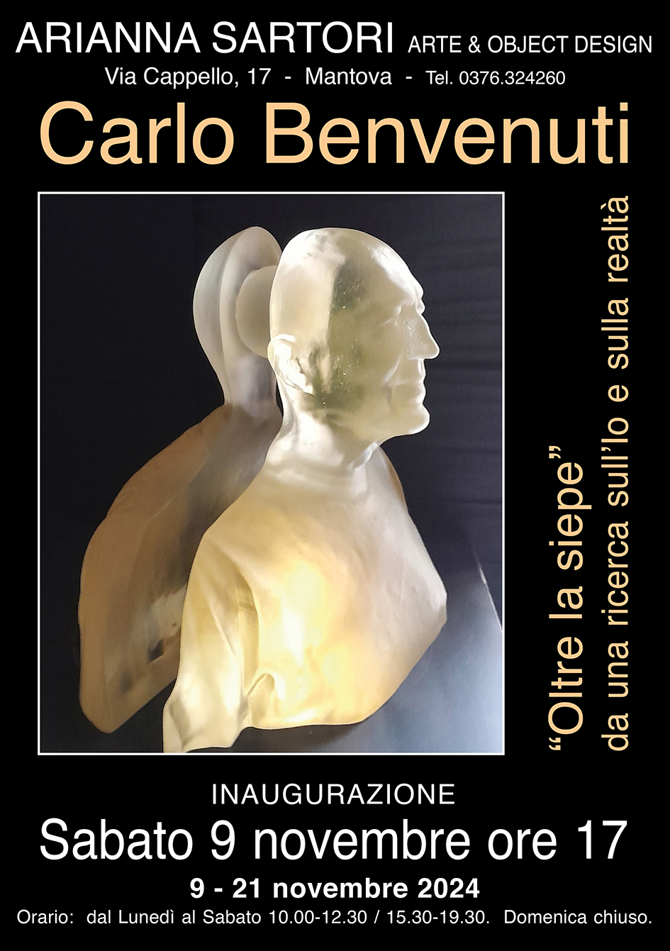 La Galleria Arianna Sartori di Mantova, nella sala di via Cappello 17, il prossimo sabato 9 novembre alle ore 17.00, inaugura la mostra dell’ Artista Carlo Benvenuti intitolata «“Oltre la siepe” da una ricerca sull’Io e sulla realtà».