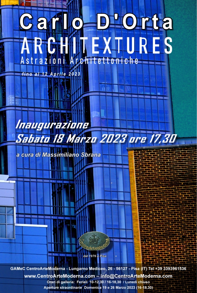Si inaugurerà SABATO 18 Marzo 2023 alle ore 17,30, presso il GAMeC CentroArteModerna di Pisa (sul Lungarno Mediceo al numero 26) la mostra "Architextures / Astrazioni Architettoniche" del noto artista fotografo Carlo D'Orta dedicata alle architetture contemporanee, in cui l’occhio dell’artista fotografo cerca geometrie astratte e rigore delle forme ordinata e curata da Massimiliano Sbrana.