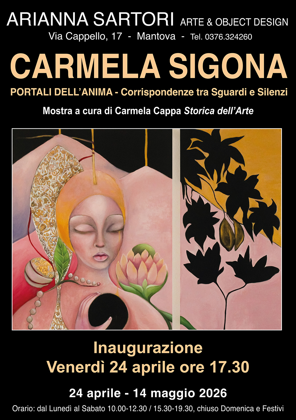 La Galleria Arianna Sartori di Mantova, nella sala di via Cappello 17, presenta la mostra personale dell’Artista Carmela Sigona intitolata “Portali dell’Anima. Corrispondenze tra Sguardi e Silenzi”.