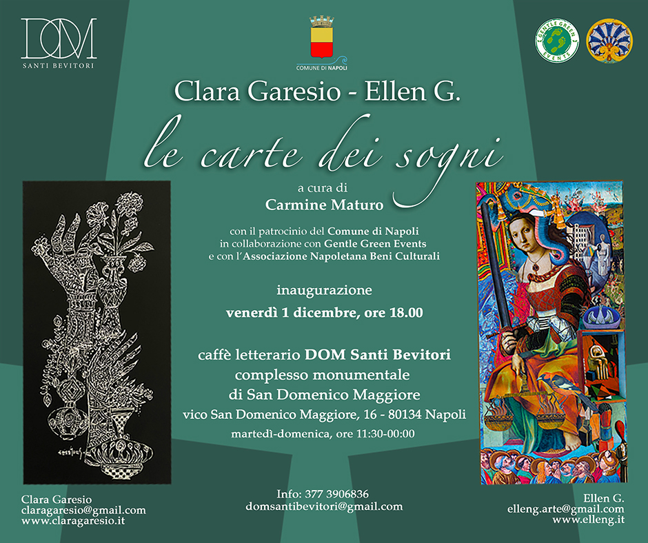 Le carte dei sogni è il titolo della bi-personale di Clara Garesio ed Ellen G. a cura di Carmine Maturo in programma a Napoli, nella suggestiva cornice del complesso monumentale di San Domenico Maggiore, presso il caffè letterario DOM Santi Bevitori, a partire dal 1 dicembre 2023.