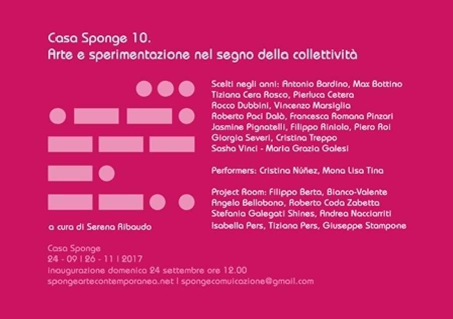 Casa Sponge si appresta a festeggiare la sua decima stagione espositiva, dopo aver vissuto un periodo intenso che ha visto gettare le basi di una realtà consolidatasi negli anni. È una casa che nasce come luogo di accoglienza, come rifugio per artisti, critici e curatori transfughi da un sistema in crisi. È uno spazio radicatosi nella realtà in cui è nato, e lungi dall'essere autoreferenziale, è diventato un laboratorio d’idee che ha cercato negli anni, e cerca tuttora, di dare il proprio contributo culturale alla comunità in cui agisce. Il senso di collettività, di condivisione e di appartenenza a un territorio, è ciò che ha portato Casa Sponge ad ospitare decine di artisti di caratura nazionale ed internazionale, a partecipare a rilevanti kermesse in Italia ed all'estero, fino ad arrivare a concepire la rassegna a,m,o - arte Marche oltre che, avviata nel 2016, rappresenta una sorta di sunto dei semi fino a qui piantati, vitali al radicarsi del lavoro futuro.
