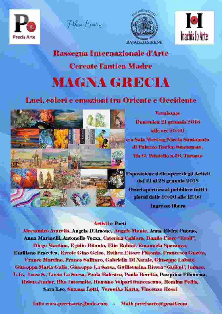 Domenica 21 gennaio 2018 alle ore 10.00 presso la sala meeting di Palazzo Barion Santamato, sito nel borgo antico di Taranto in via G. Paisiello n.56, ci sarà l’inaugurazione della rassegna internazionale d’Arte “Cercate l’antica Madre: Magna Grecia, Luci, colori e impressioni tra Oriente e Occidente”; organizzata dalla Precis Arte di La Sorsa Lucia. Presenti al Vernissage il dott. Arcangelo Santamato, il prof. Francesco Urso, il direttore artistico Vincenzo Massimillo ed il curatore della Rassegna Lucia La Sorsa, responsabile della Precis Arte.